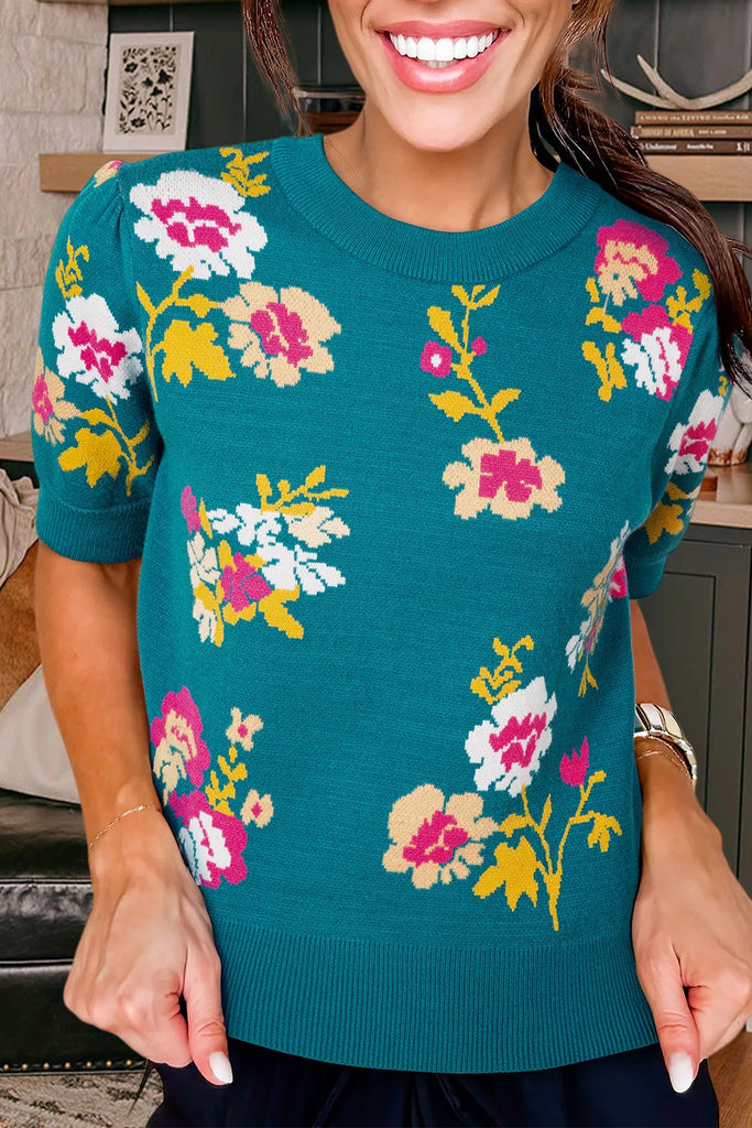 Saffron Boho Floral Print Round Neck Ruffle Trim Colorful Blouse