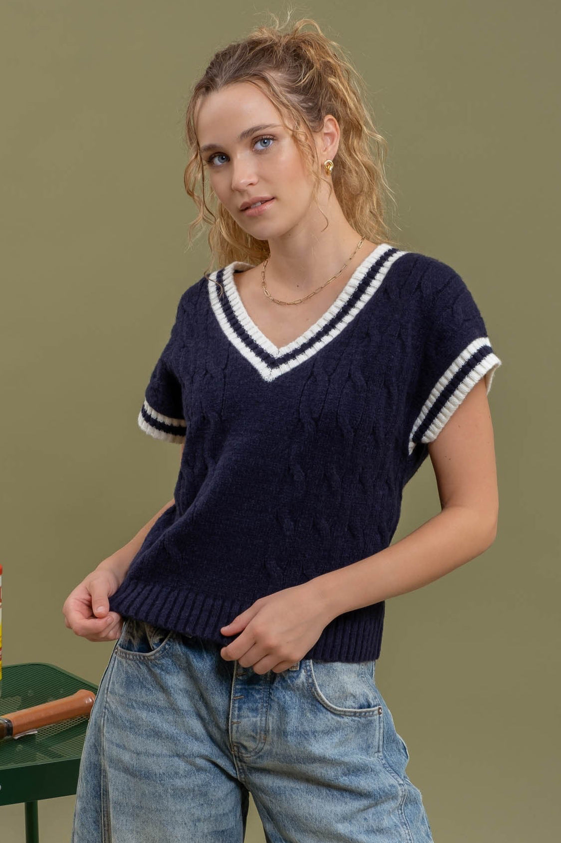 Coastal Navy Short Sleeve Cable Knit Sweater