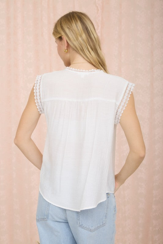 Featuring intricate lace trim along the shoulders and a lightweight flowy fit, this top feels just as good as it looks. The subtle button-front detail and breezy fabric make it an easy choice for warm days, whether you're dressing it up or keeping it casual.